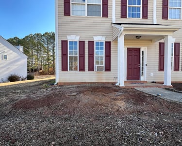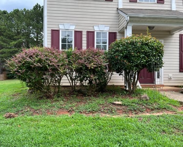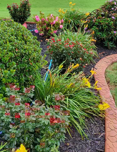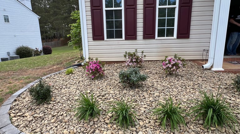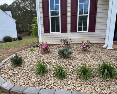 In the backyard we took a blank canvas that only had three trees planted by the builder and turned it into a beautiful place by adding butterfly bushes, azaleas, and drift roses. It was all enclosed by a stone border and slate rock was added for mulch.